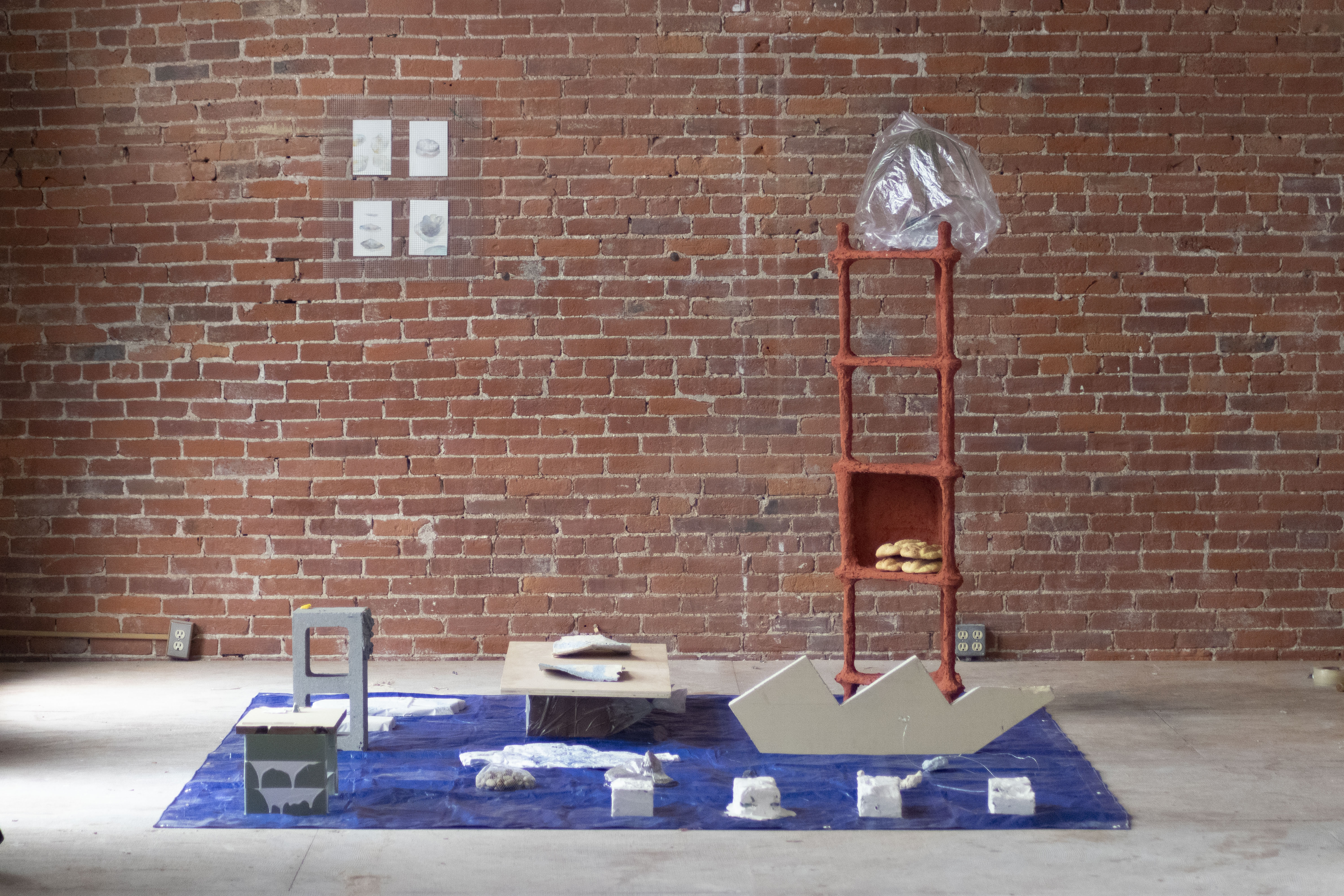 A site specific installation while a resident at 77Art in Rutland, VT composed of an accumulation of transformed natural and artificial materials re-presenting the embedded tension between a de-industrialized city and its surrounding landscape. A discounted plant in a bag from the florist to protect it from the Vermont cold, serpentine breads on a found shelf coated in and modified by paper pulp and cement pigment, and companion paintings attached to the far wall. The grotesque has its roots in the uncovering of Nero’s palace and the ancient roman paintings within that became known in Italian as “grottesche” meaning “grotto-ish”. In the absence of context (i.e. the intention and method of composition) these works are rendered mythic and profoundly disturbing. Their formal elements to be forever recombined in a grotesque style with weakening ties to the original, a process of cultural de- and re-composition that resists attempts to categorize and exploit it.