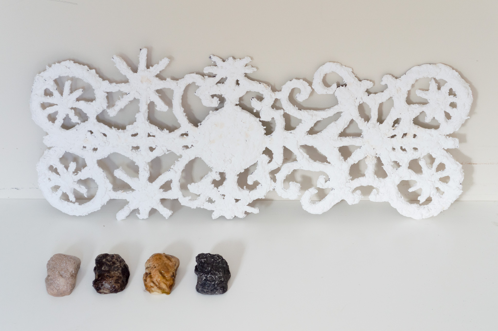 Accompanying two plastic hide-a-key rocks and two replicas rendered in marzipan colored with powdered food-safe pigments is a found lawn ornament coated and altered with modeling compound, considering what Umberto Eco describes as a “crèche-ification of the bourgeois universe” and the function of the garden as a diorama or miniature of broader concerns about potential penetrability and loss.