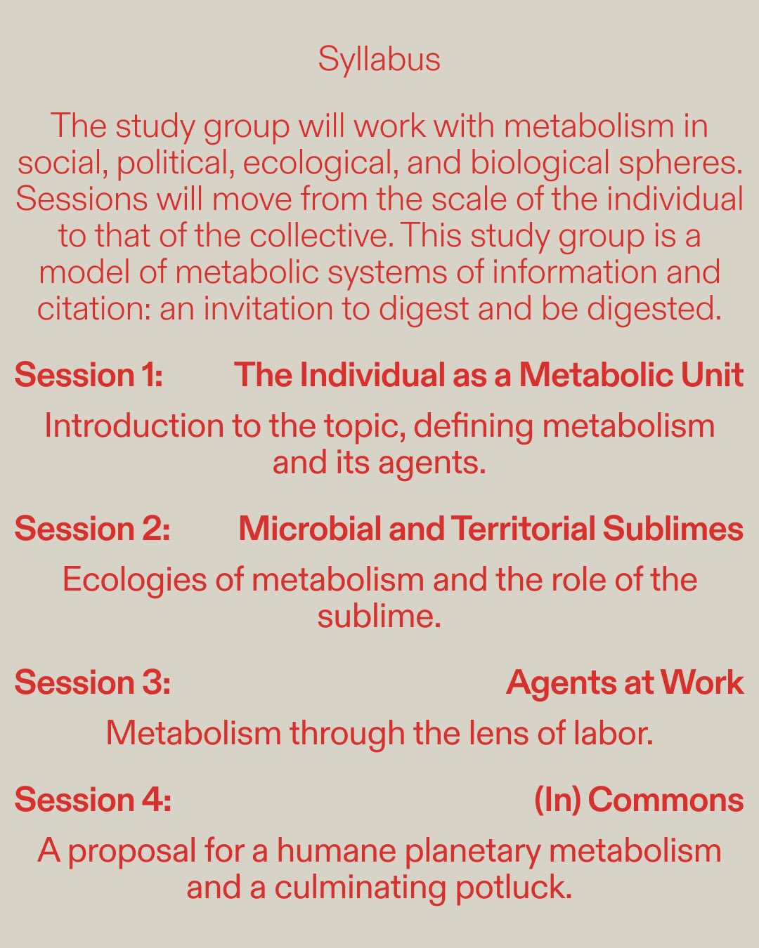 This study group and its surrounding body of research focused on an expansive definition of metabolism as a conceptual means to reconcile vast and microscopic systems, cultivating a critical solidarity with the world around us. The study group was bolstered by ongoing writing and pedagogical work on the topic.