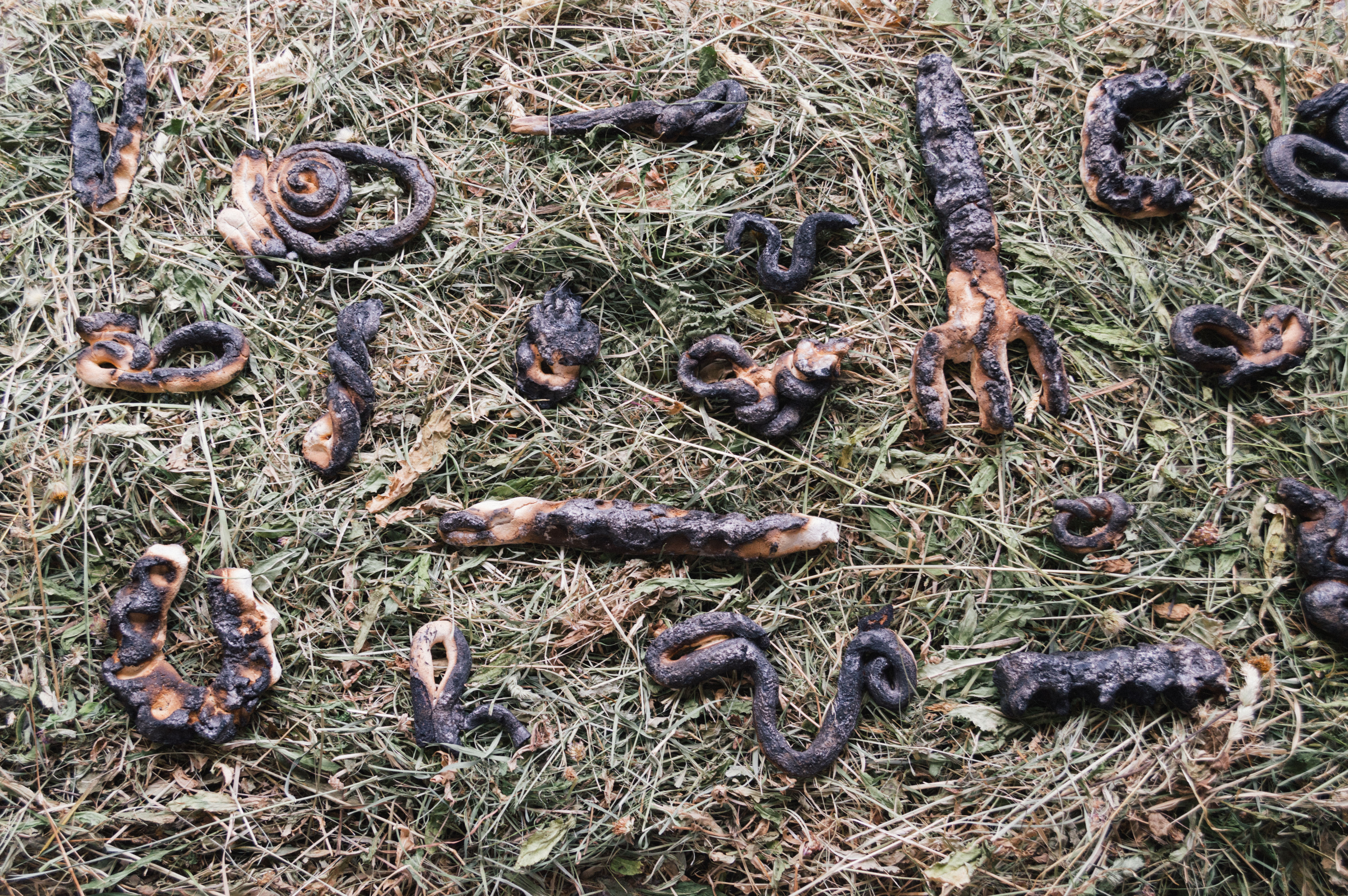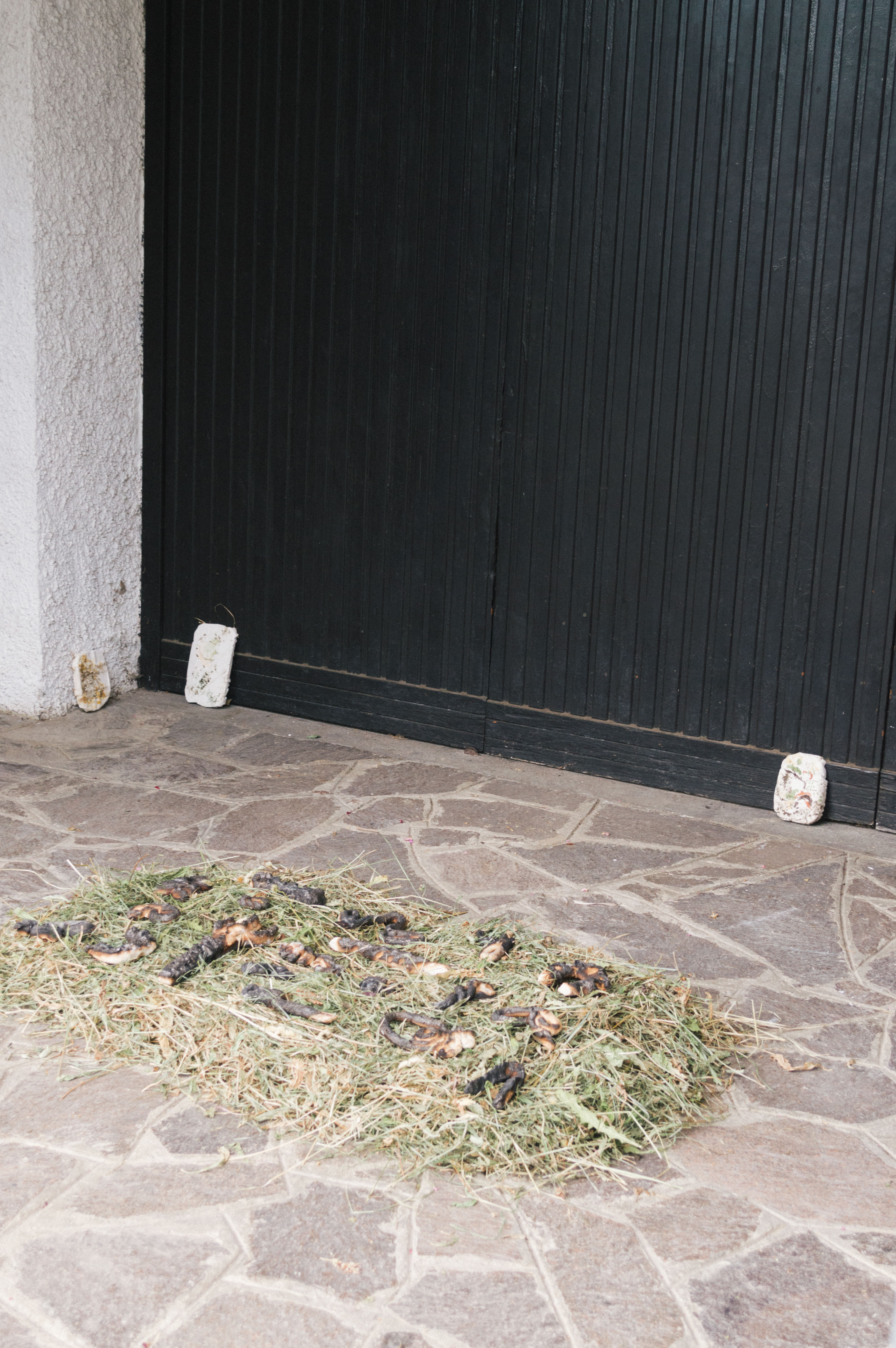 in July of 2022. Materials include hay, flour, salt, ash, plaster, soil, and earth pigments.