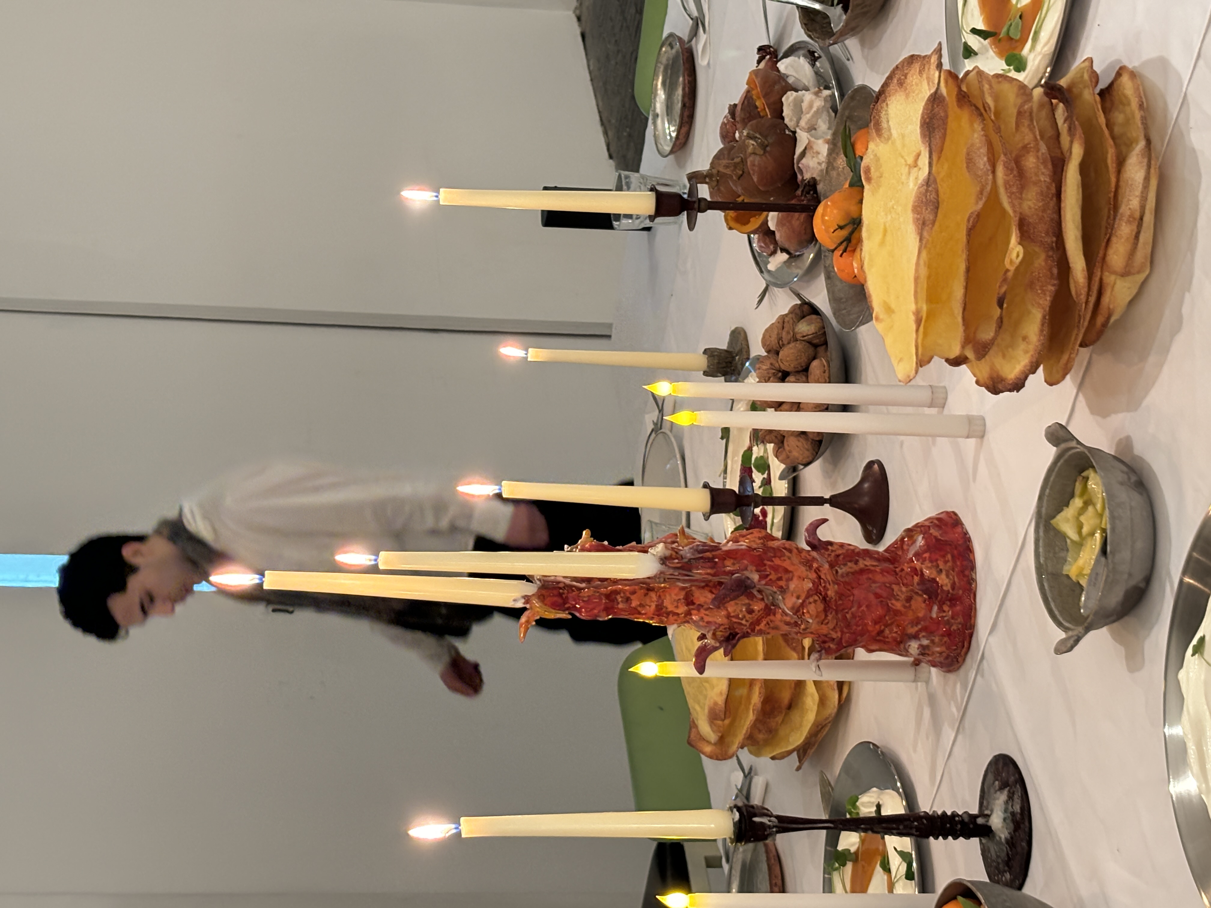 A dinner at Cubitt initiated by Aliaskar Abarkas as a further extension of the collaborative modality of Abarkas‘ All the Whistlers. The meal worked with alternative registers of communication and an expansive definition of language through resonances of sound, texture, and flavor. Classical hierarchies of senses and meaning dissolve and reorder as diners were encouraged to consider various registers of conviviality and sound in the edible encounter. Cracking of shells, snapping of skins, grinding of seeds, rattling of grains, splashing of sauce, fizzing of ferments, slapping of dough, stripping of leaves, tearing of peels. Diners excavated vegetables roasted in salt to be assembled with a range of fermented condiments, fresh dairy, carta di musica (sheet music) flatbreads, and cultivated and wild greens and nuts. Bodies next to bodies listening to bodies consuming bodies made by bodies…