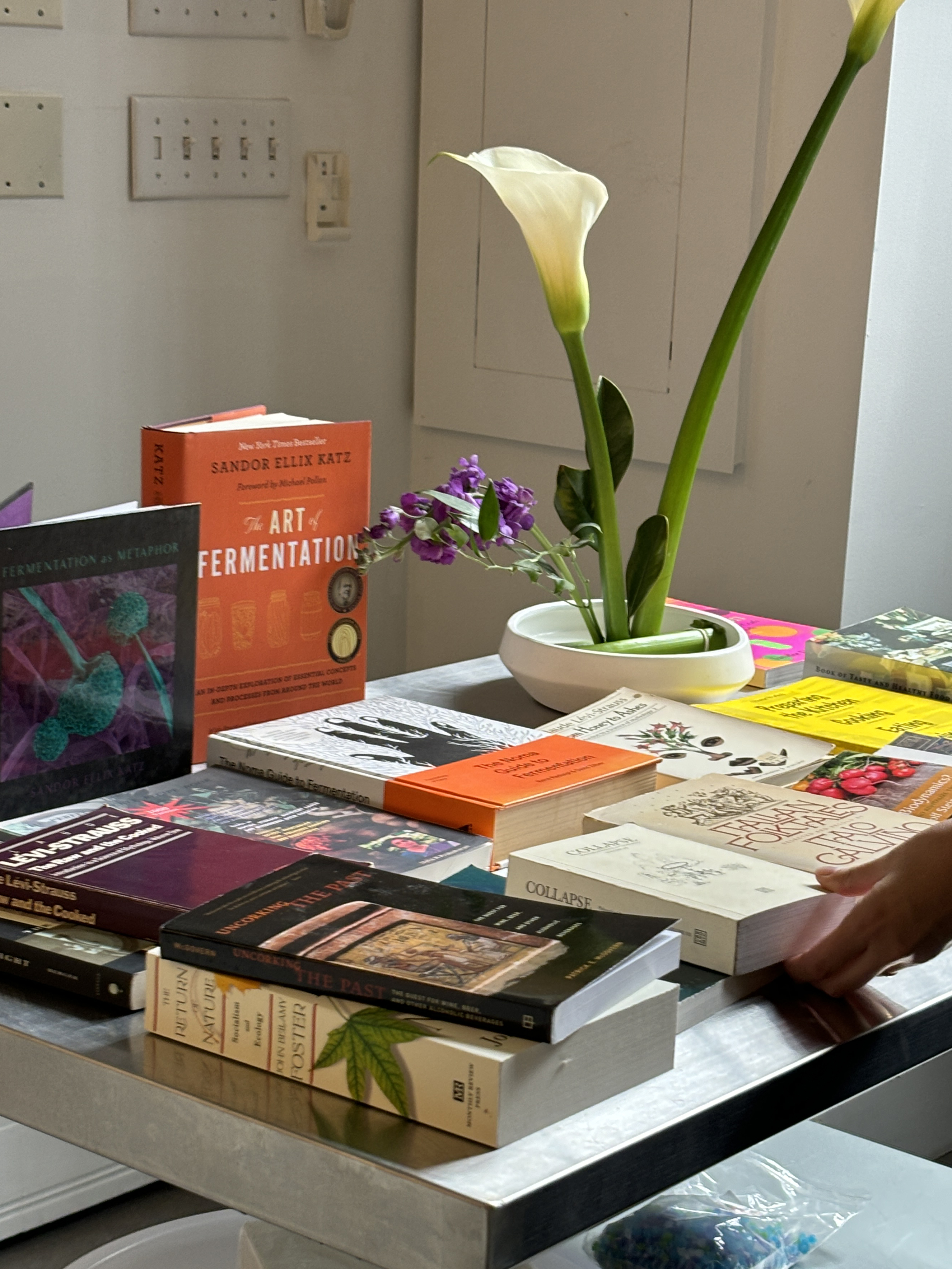The workshop began with an introduction to the process and theme followed by the preparation of various fruits and vegetables for fermenting. Each participant took home their ferments to complete the process (i.e. waiting) to enjoy later at home. Sample ferments and additional microbially influenced snacks and beverages were be provided including sourdough flatbreads, labne, fermented plum paste, sungold tomatoes, basque peppers, chiles, and wild sumac and mountain mint kombucha. There was also a mini ‘reading room’ of related texts for perusal during the workshop.